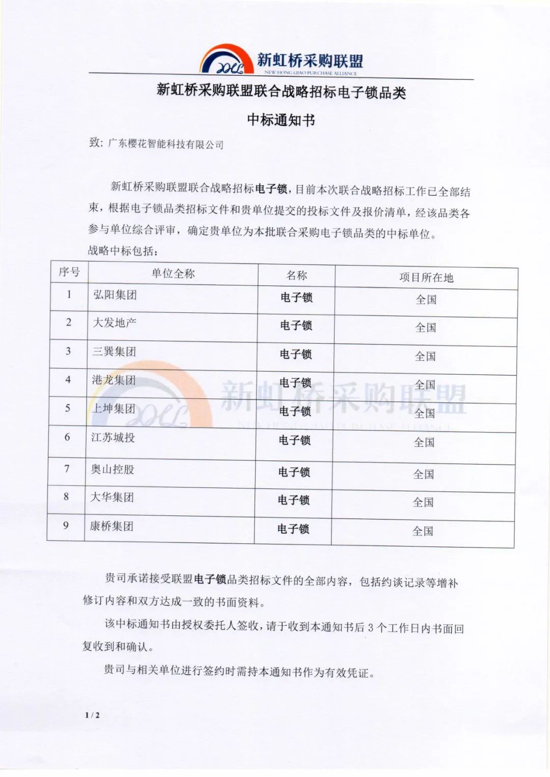 近日,新虹橋采購聯盟開展了電子鎖品類聯合戰略招標項目,櫻花從眾多智能鎖品牌企業中脫穎而出,獲得地產企業的一致青睞,成功中標。成為包括弘陽、大發、三巽、港龍、上坤、城投、奧山、大華 、康橋(排名不分先后)在內的9家知名地產企業2021年至2023年度智能門鎖供應商。